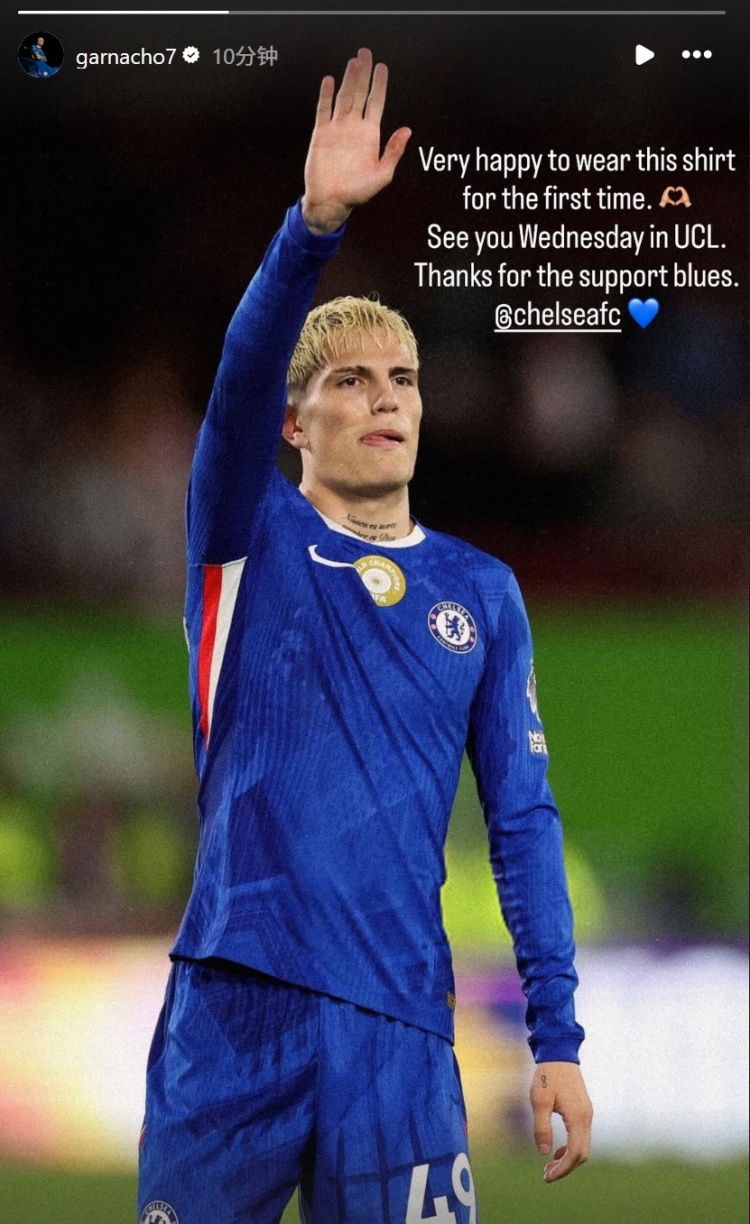加纳乔在个东谈主社媒也晒出本场相片,配文写谈:“十分昂扬身披这身战袍迎来首秀,咱们周三欧冠比赛重逢,感谢蓝军球迷的支持!”