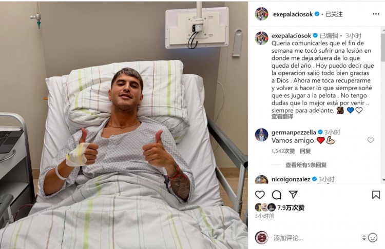 帕拉西奥斯社媒晒出我方躺在病床上竖起大拇指的像片,并写谈:“我思示知人人,上周末我横祸受伤,这将让我缺席本年剩余的比赛。”