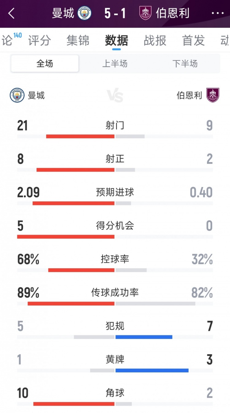 9月28日讯 在本轮英超,曼城5-1大捷伯恩利,以下为两边全场数据对比: