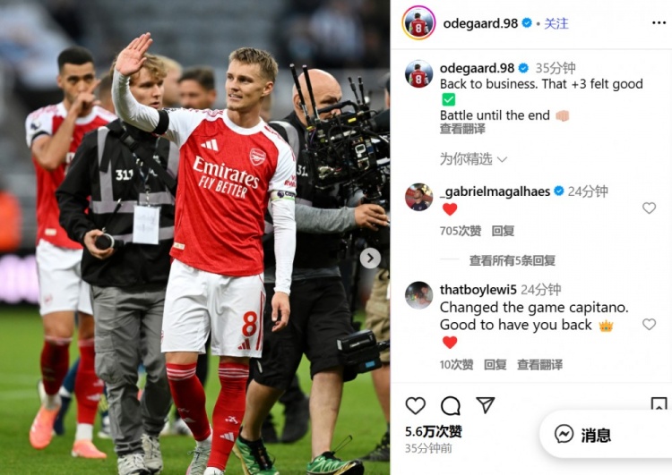 9月29日讯 阿森纳在本轮英超2-1绝杀逆转纽卡,赛后,厄德高更新了酬酢媒体。