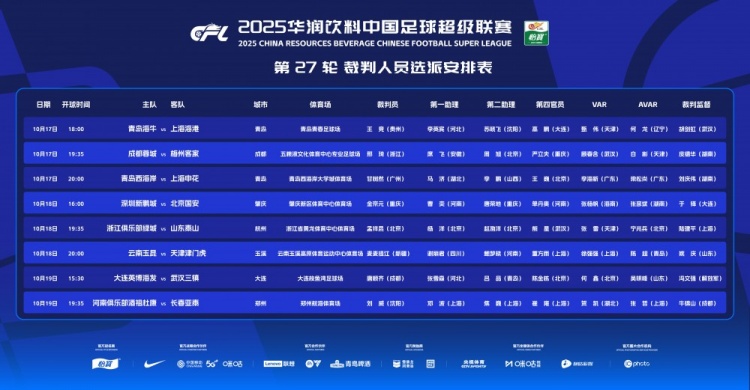 10月18日讯 据博主“裁判圈”报说念,中超第27轮云南玉昆vs天津津门虎,将初度出现三名女裁判同场功令。
