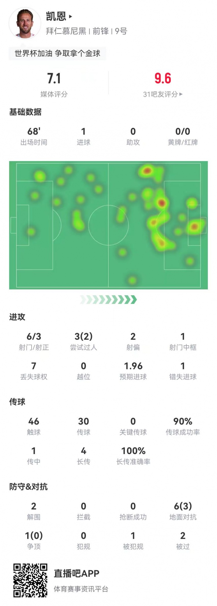 你的位置:英超直播 > 德甲 > 凯恩本场6射3正进1球+1中框+1失良机 4长传一齐告捷 获评7.1分