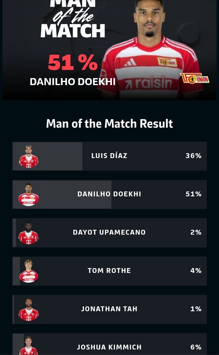 11月9日讯 2025-26赛季德甲第10轮,柏林鸠合2-2战平拜仁。柏林鸠合后卫多基首发出战,赛后51%得票率当选全场最好。
