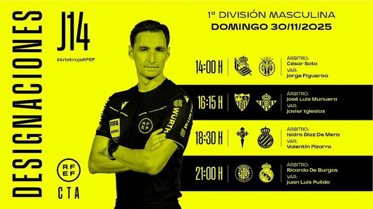 11月29日讯 12月1日4点,皇马将在西甲客场对阵赫罗纳,西甲公布本场裁判组名单。