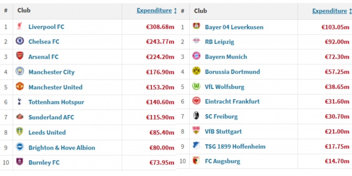 若是对比英超和德甲今夏转会窗的开销不错发现,在英超转会窗开销榜上排名第10的伯恩利照旧破耗7395万欧,这个数字以至不错在德甲的开销榜上排进前三。