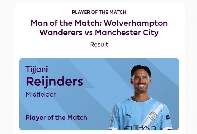 赛后据英超官方音讯,曼城中场赖因德斯以52%的得票当选此役全场最好球员。