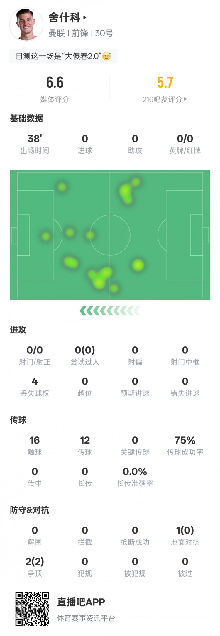 8月25日讯 2025-26赛季英超第2轮,曼联客场1-1富勒姆。舍什科替补出战,多项数据挂零,只消2次争顶均奏效。