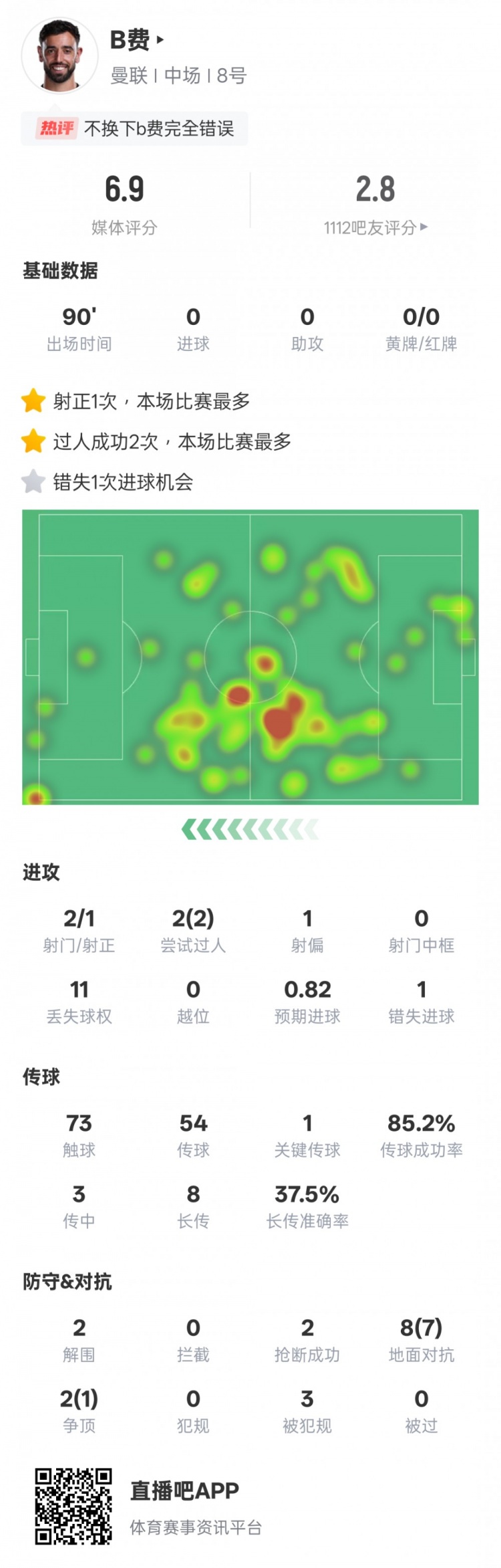 8月25日讯 2025-26赛季英超第2轮,曼联客场1-1富勒姆。B费首发出战,罚丢点球,另外他有2次过东说念主成效和1次要津传球,评分6.9。