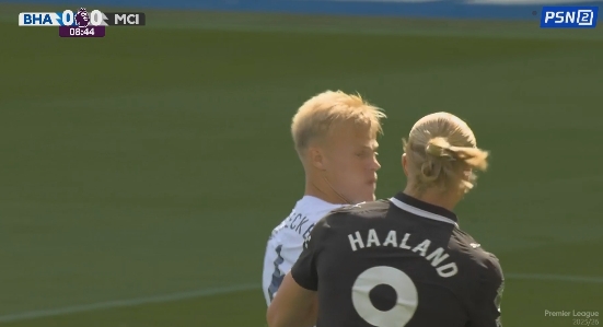 08月31日讯 曼城vs布莱顿第9分钟,哈兰德单刀力量太小被充公!跟防的范赫克推搡哈兰德,随后哈兰德叛逆不睦!