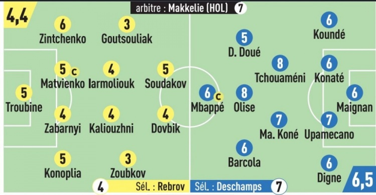 法国首发:迈尼昂6分、迪涅6分、于帕梅卡诺7分、科纳特6分、孔德6分、琼阿梅尼8分、科内7分、巴尔科拉6分、杜埃5分、奥利塞8分、姆巴佩6分