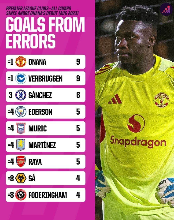 9月9日讯 曼联门将奥纳纳离队在即,OPTA也清点了自奥纳纳2023年8月加盟曼联以来,英超悉数门将在各项赛事出现诞妄导致失球数,奥纳纳比肩最多。具体如下: