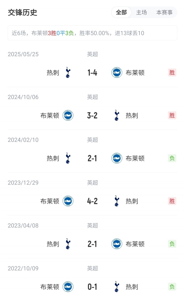 现在英超积分榜上,布莱顿1胜1平2负积4分,位列第13;热刺3胜1负积9分,位列第3。