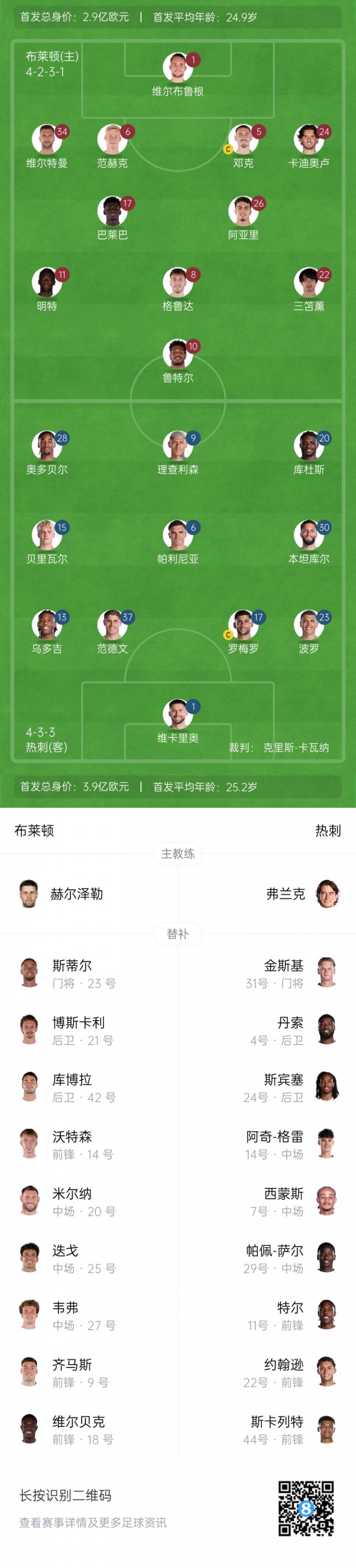 布莱顿首发:1-维尔布鲁根、5-邓克、6-范赫克、24-卡迪奥卢、34-维尔特曼、17-巴莱巴、26-阿亚里、8-格鲁达、10-鲁特尔、11-明特、22-三笘薰