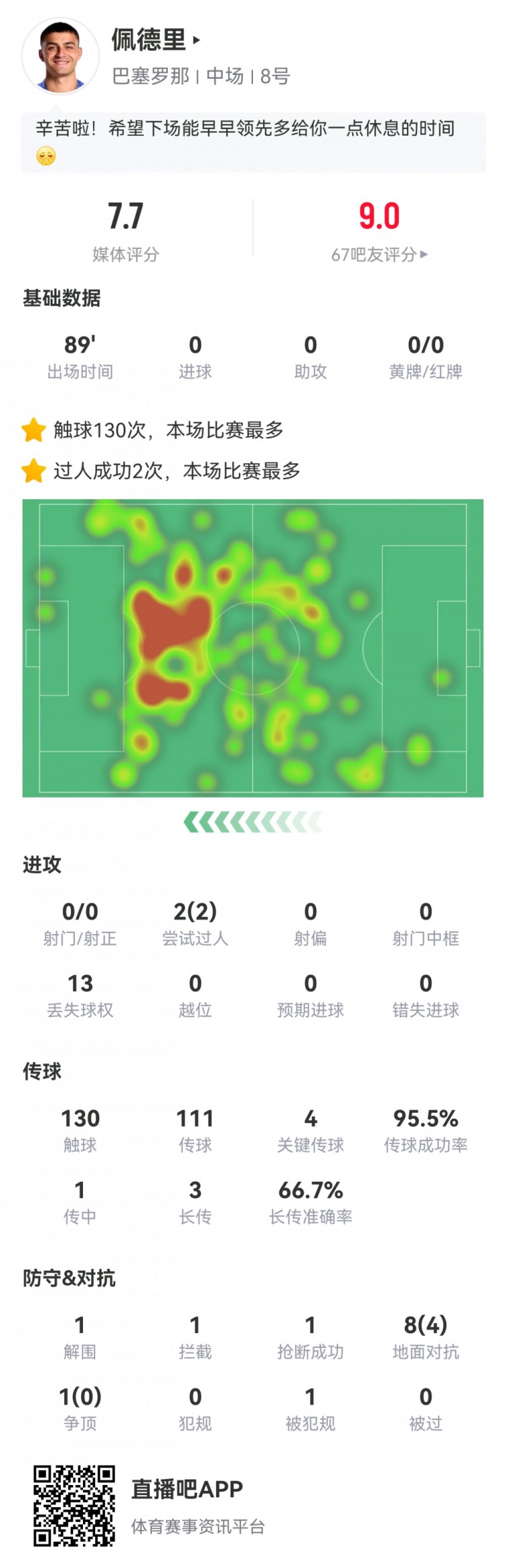 9月26日讯 本轮西甲,皇家奥维耶多主场1-3巴萨。此役佩德里首发89分钟被换下,球员全场要点数据如下↓