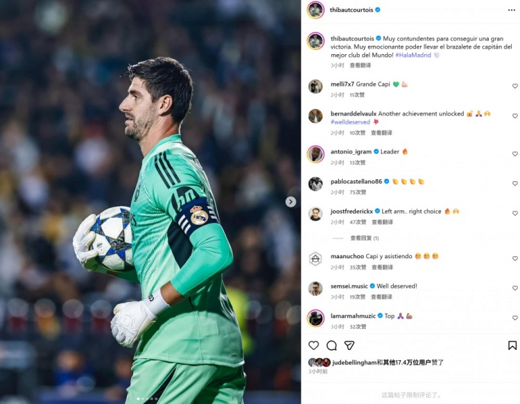 本场比赛库尔图瓦送出助攻,还戴上了队长袖标,赛后他也在社媒晒照写谈:“咱们用出色发扬得到了一场精彩的告捷。偶而佩带寰宇上最佳俱乐部的队长袖标,感到十分抖擞。”