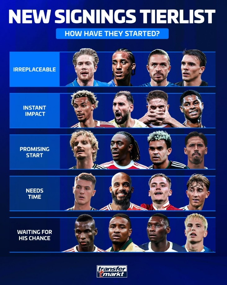 10月1日讯 德转为本赛季新援施展作念出评级,其中德布劳内、若昂-佩德罗等最为出色,具体如下: