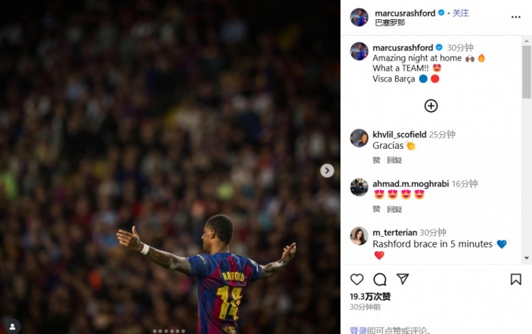 在酬酢媒体上,拉什福德庆祝了本场比赛的收效,他写谈:精彩的主场之夜,何等棒的一支球队!加油巴萨!