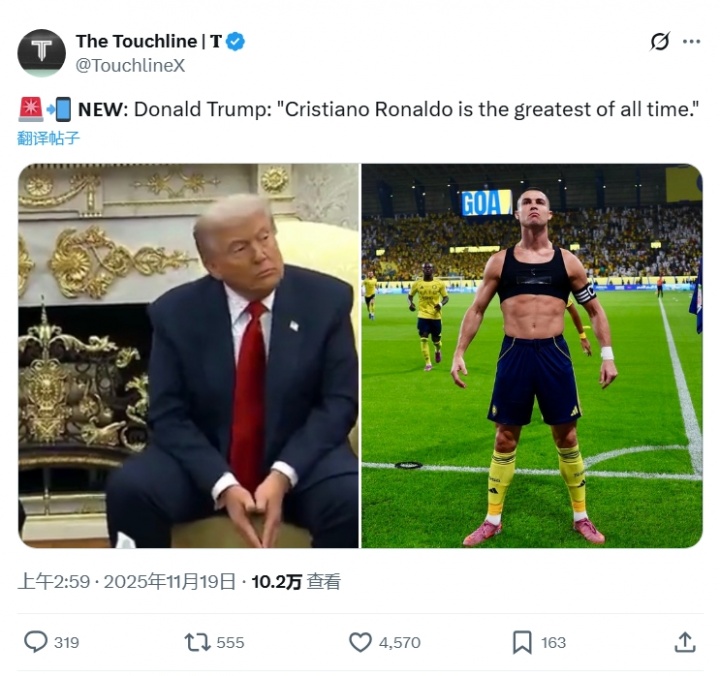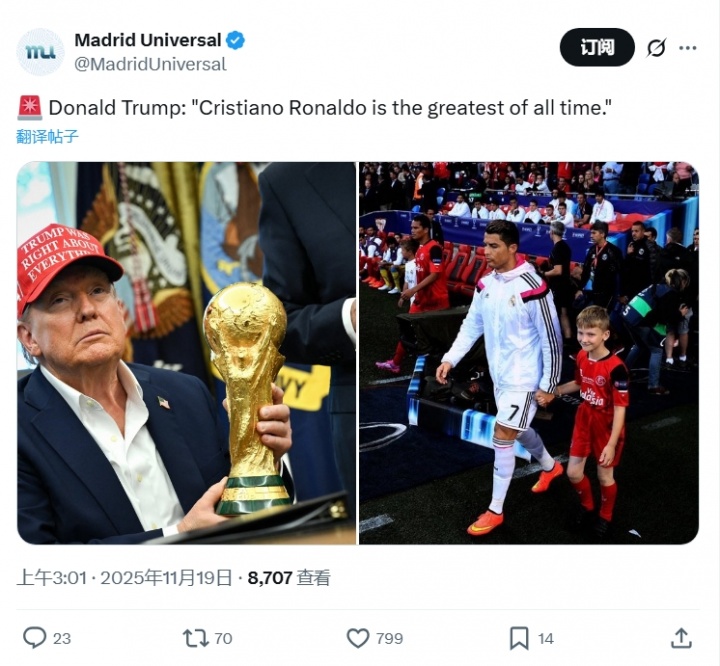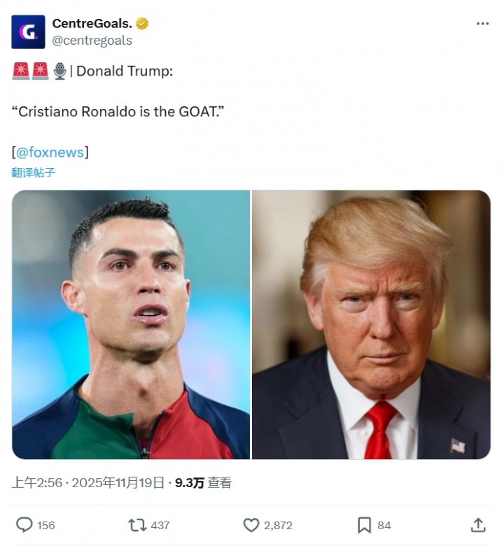11月19日讯 此前报谈称,沙特王储穆罕默德·本·萨勒曼在白宫与特朗普会面,C罗受到特朗普管待。沙特王储与特朗普会面运行后,有多个博主、自媒体称特朗普暗示:“C罗是历史最好球员。”