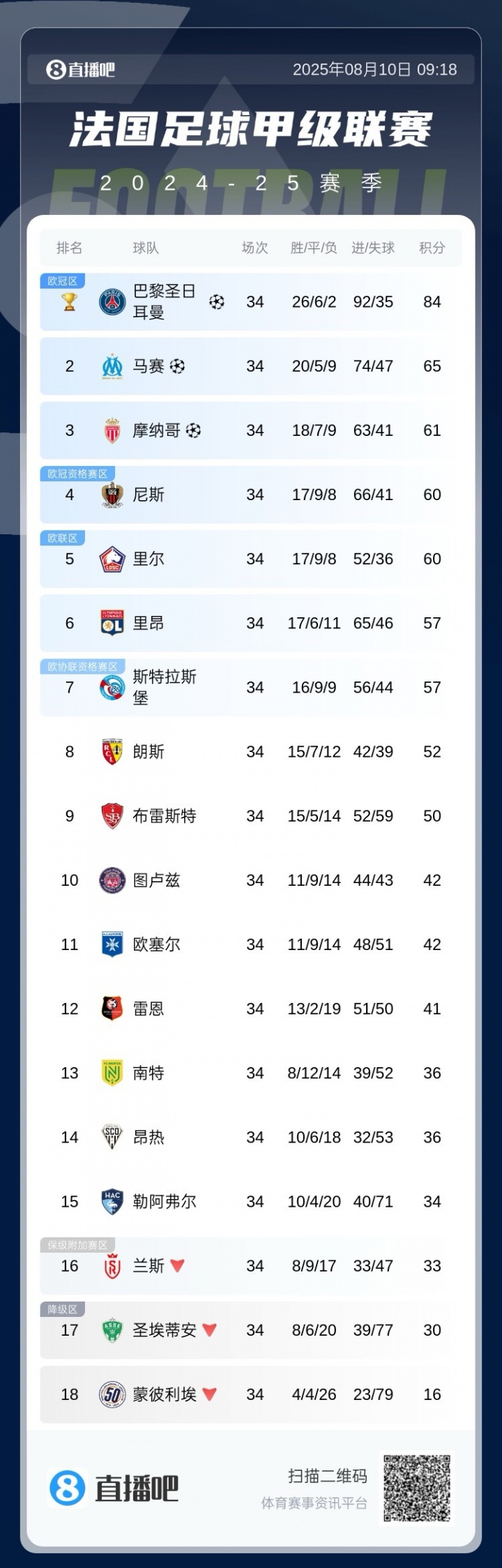 24/25赛季法甲积分榜回顾: