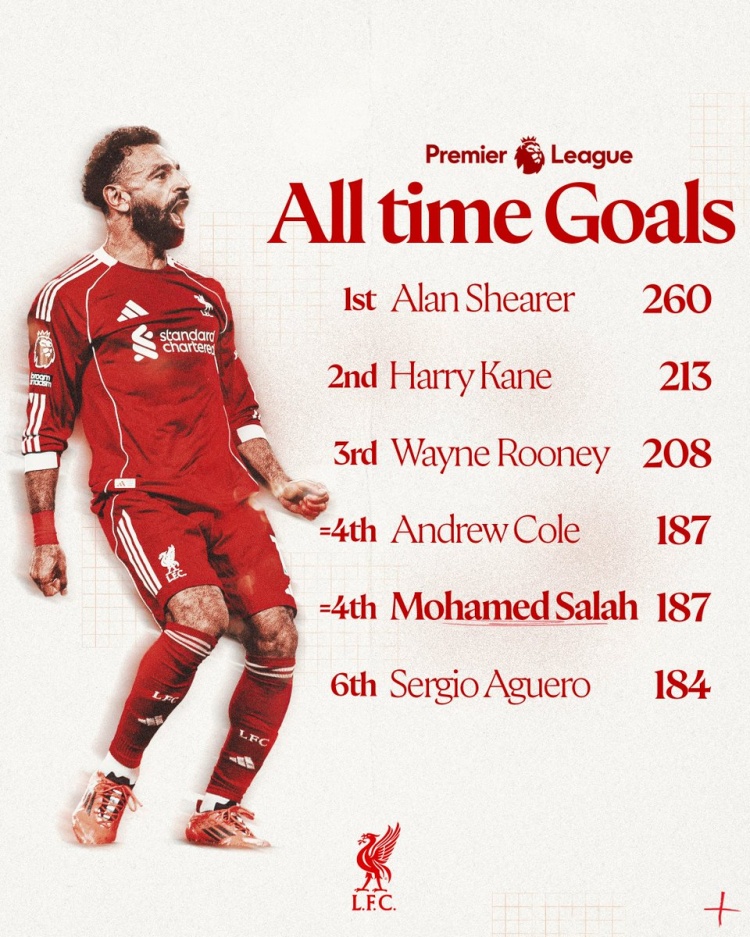 利物浦官方社媒晒出英超历史射手榜,此役过后萨拉赫的英超进球数达到187个,追平安迪-科尔并列第四。