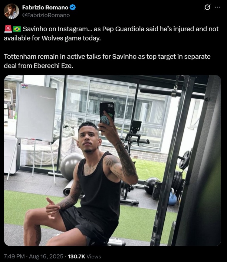 你的位置:英超直播 > 西甲 > 萨维尼奥社媒晒照,罗马诺:热刺仍在就签下这名球员积极谈判