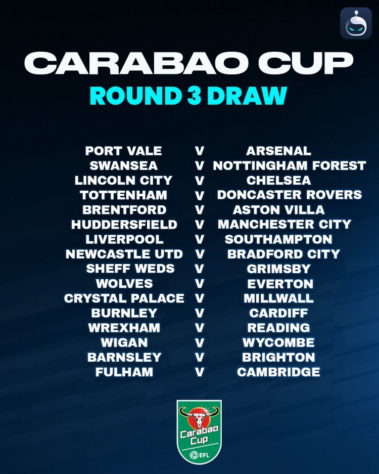 8月28日讯 英格兰联赛杯第三轮抽签结果揭晓,具体如下: