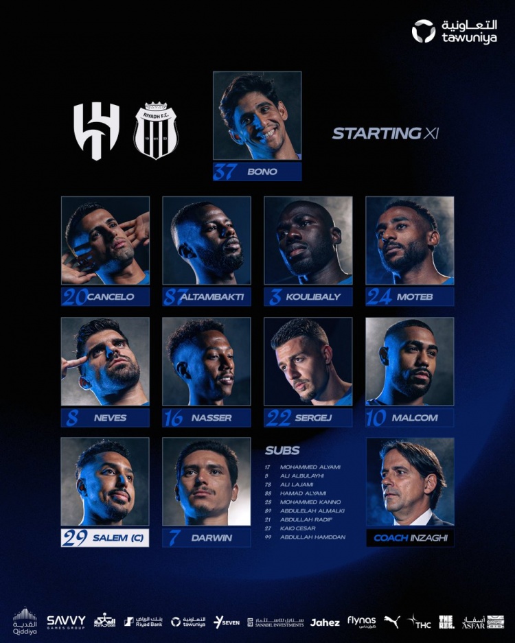利雅得新月首发:37-布努、20-坎塞洛、87-坦巴蒂、3-库利巴利、24-穆塔卜-哈尔比、8-鲁本-内维斯、16-纳赛尔-多萨里、22-米林科维奇、10-马尔科姆、29-萨利姆-多萨里、7-努涅斯