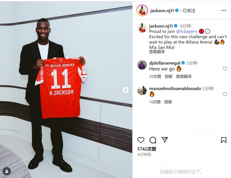 杰克逊晒出手拿拜仁11号球衣的照片,并写道:“很自豪能加盟拜仁,对这个新挑战感到兴奋,迫不及待想要在安联球场踢球了!Mia San Mia!!”