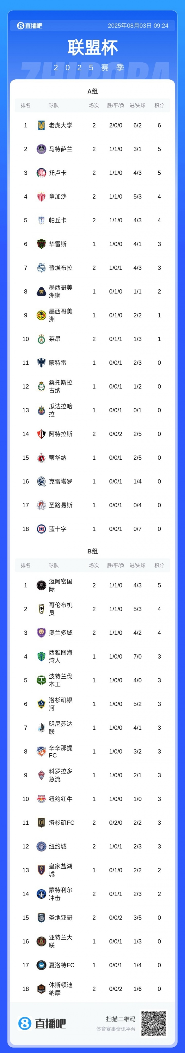 08月03日讯 联盟杯第二轮,迈阿密国际点球大战击败拿加沙,取得两个积分,赛后2轮5分暂时升至B组第一,同时间仍有其他场次在进行。
