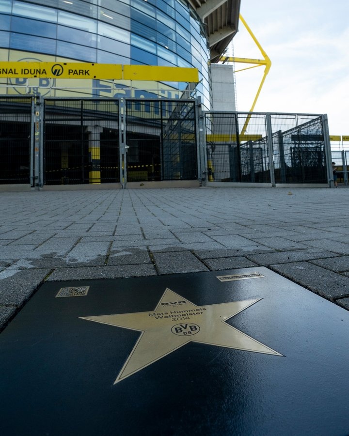 这块镶有金色星星、刻着“马茨-胡梅尔斯”及“2014年世界冠军”字样的黑色石板,已被嵌入北看台前广场的地面。
