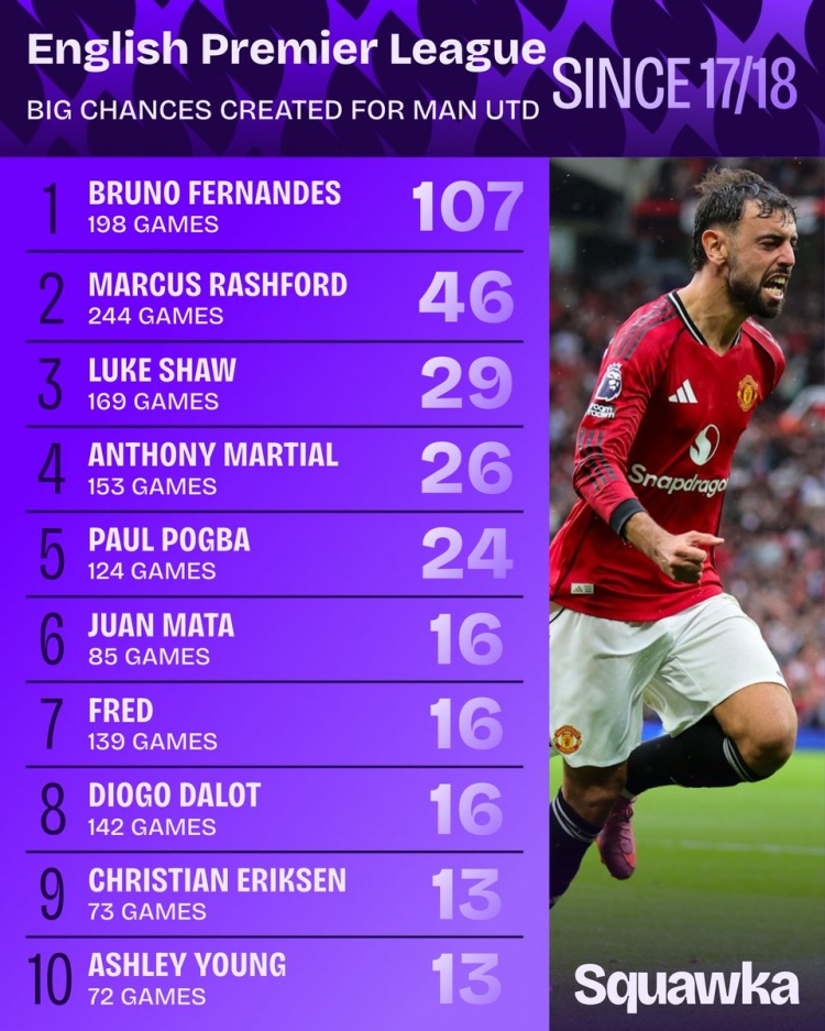9月9日讯 数据显示,自2017/18赛季之后,B费是曼联在英超创造绝佳机会最多的球员。