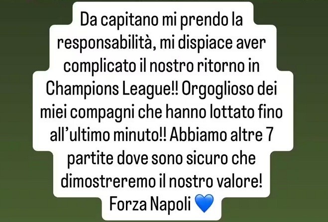 9月20日讯 那不勒斯队长迪洛伦佐在社媒发文,为自己在欧冠比赛中的红牌道歉。