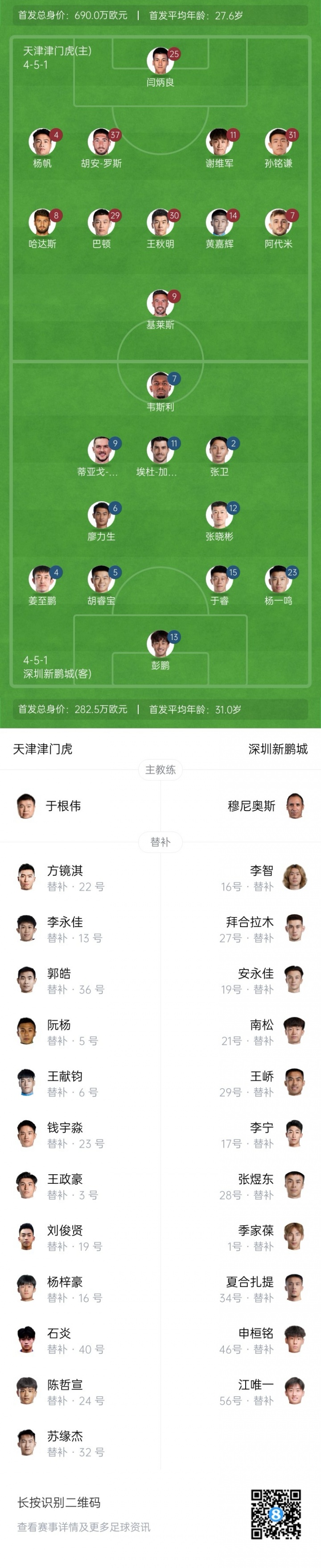 09月21日讯 北京时间今晚19点35分,中超第25轮,天津津门虎vs深圳新鹏城,赛前双方首发阵容出炉。