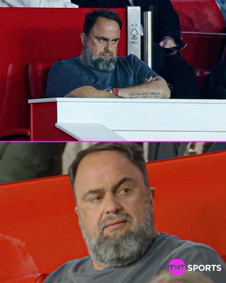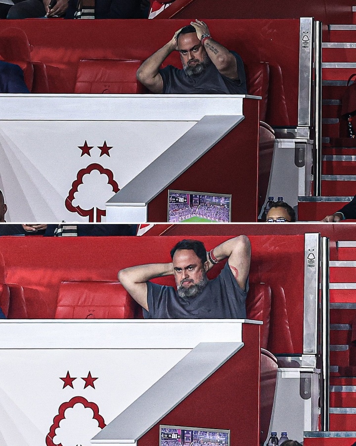看台上,诺丁汉森林老板、希腊船王马里纳基斯十分郁闷,死亡凝视+抱头怒目,看着场上的比赛。