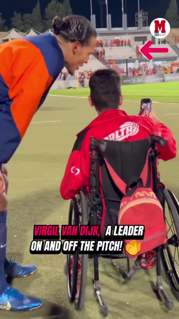 此役范迪克为荷兰踢满全场,帮助球队取胜。《马卡报》社媒晒出视频,范迪克亲切地与场边坐轮椅的球迷合影,并为其签名。