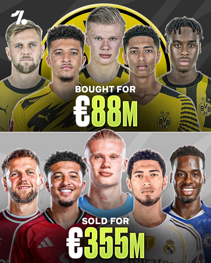 10月15日讯 Onefootball列出了近年来多特蒙德在转会市场上的一系列优秀操作,花费8800万欧元签下哈兰德、桑乔、贝林厄姆等5名球员,并以总计3.55亿欧元将他们出售。