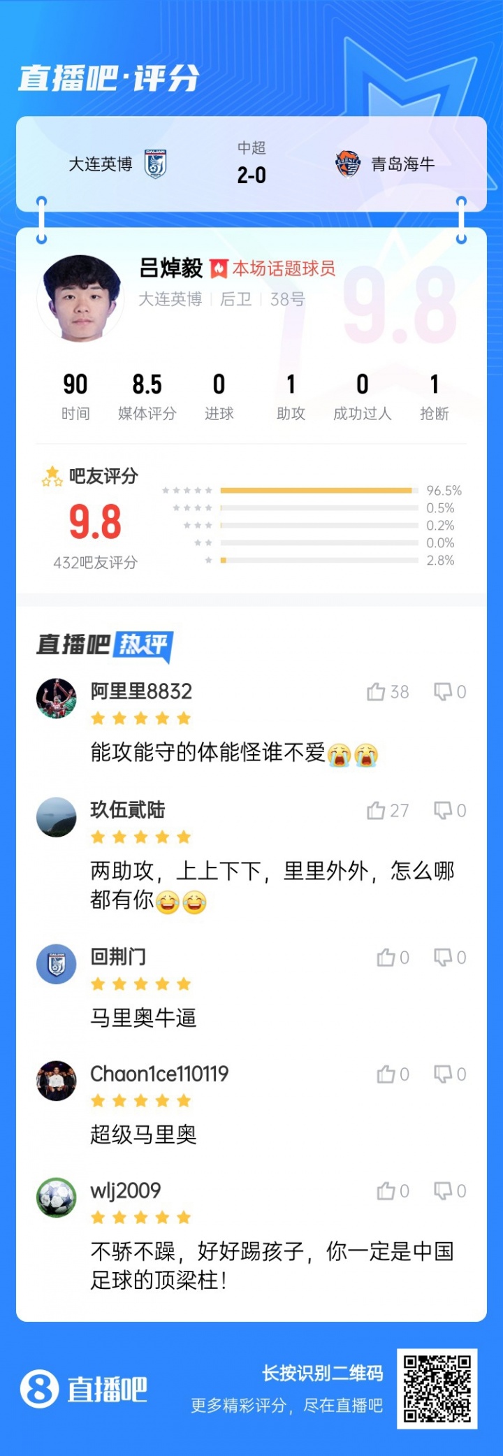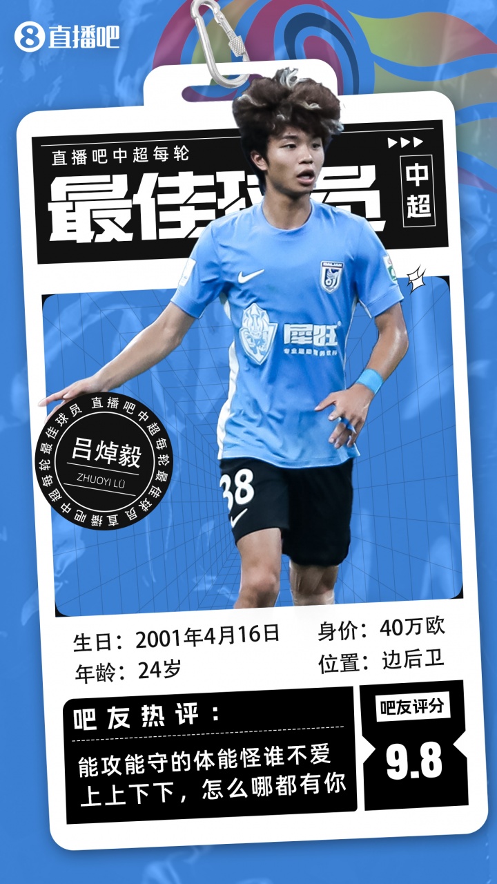 【】中超第19轮最佳球员评选出炉,大连英博“马里奥”吕焯毅当选最佳!他在本轮比赛中贡献精彩的弧线助攻并造点,帮助大连英博2-0海牛收获胜利。