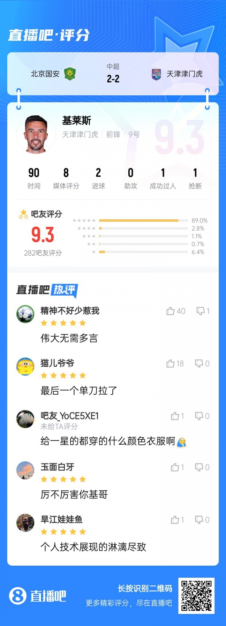 【】中超第四轮最佳球员:基莱斯当选,为了天津永远进攻!