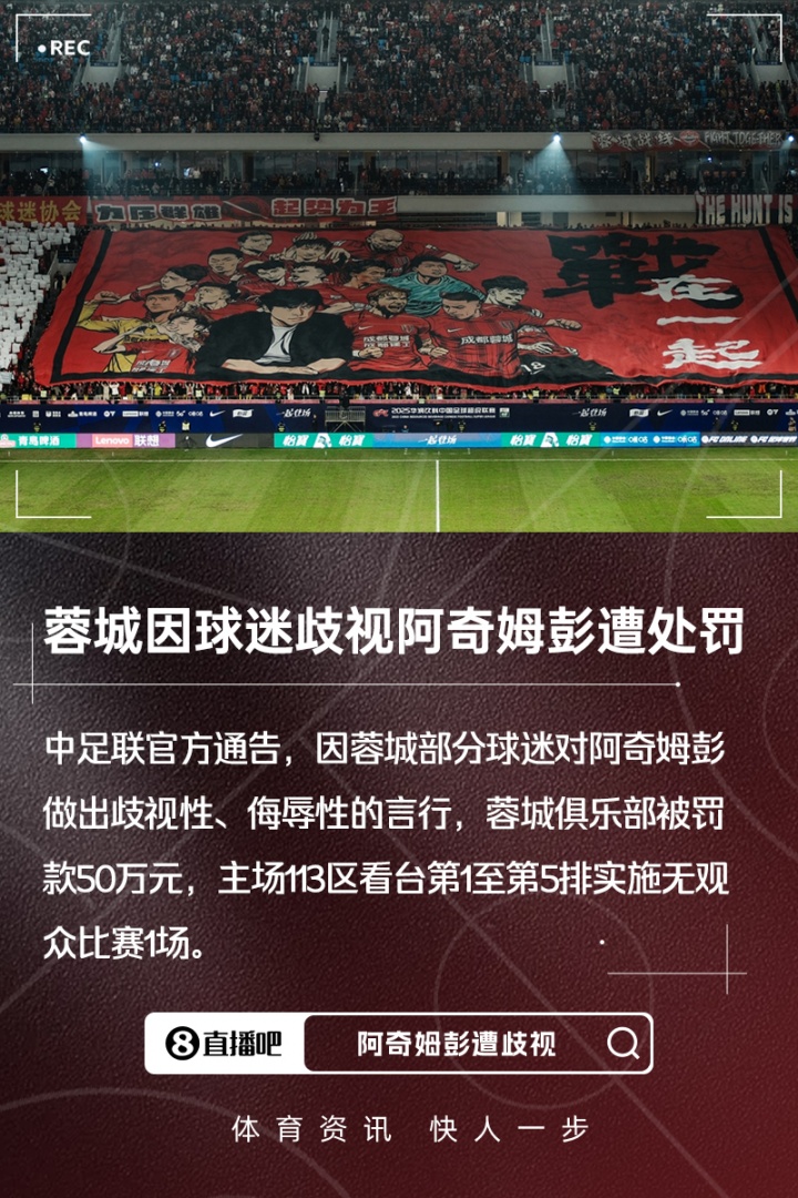 11月22日讯 中足联官方发布公告,因蓉城部分球迷对阿奇姆彭做出歧视性、侮辱性的言行,蓉城俱乐部被罚款50万元,部分看台空场。