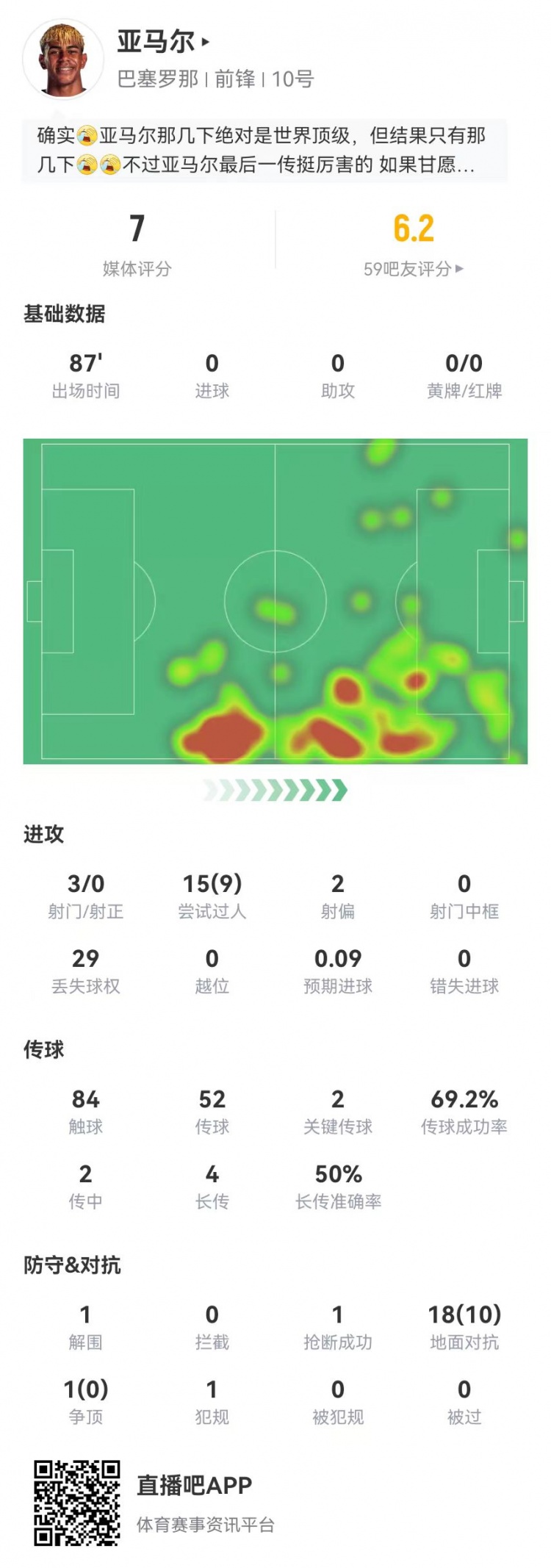 12月3日讯 巴萨在本轮西甲对阵马竞,亚马尔本场数据如下: