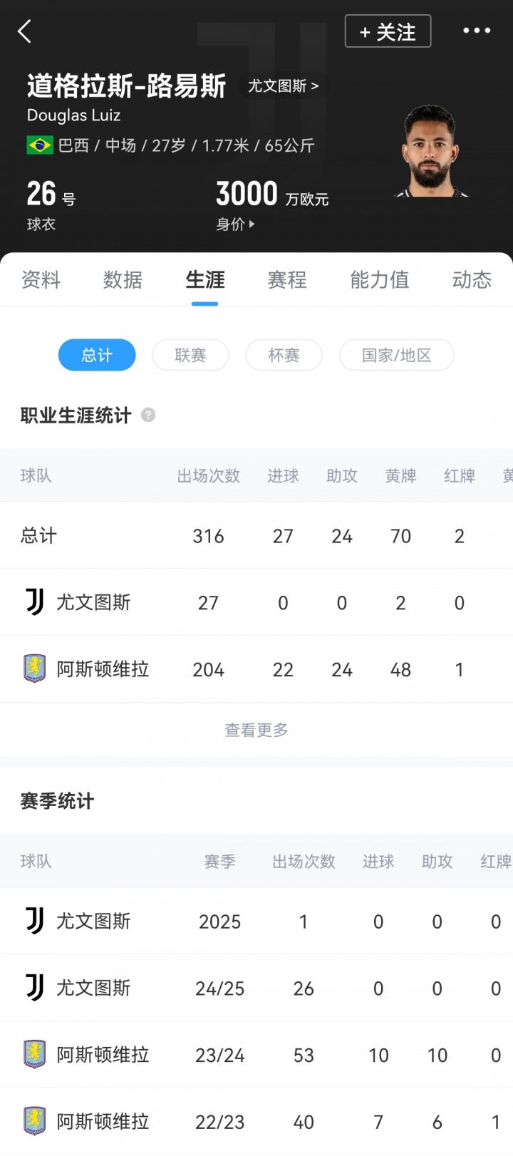 谈格拉斯-路易斯前年夏窗以5150万欧元的转会费从维拉加盟尤文,但扫数2024/25赛季,谈格拉斯-路易斯只出场26次,莫得孝顺任何进球或助攻。