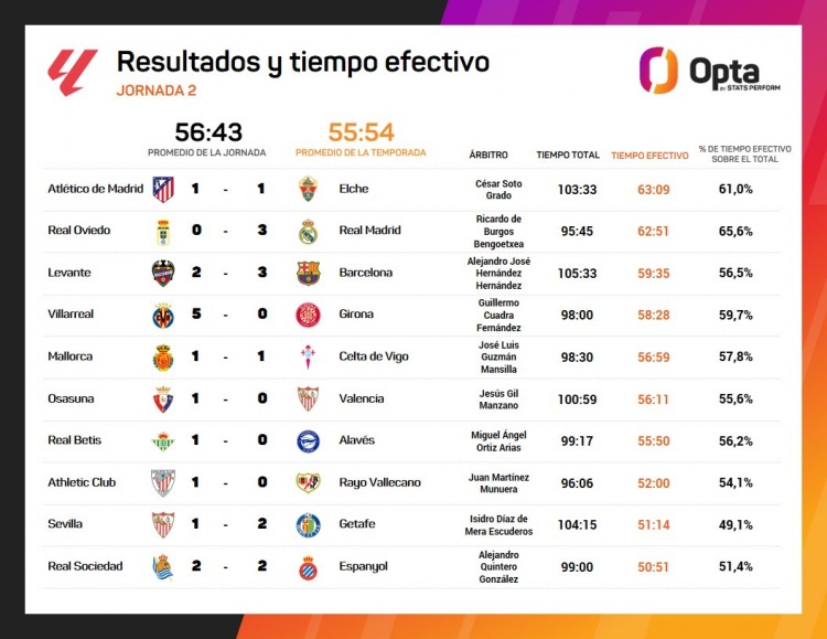 8月26日讯 Opta统计了西甲第二轮的净比赛技巧,马竞vs埃尔切净比赛技巧63分09秒最长,皇家奥维耶多vs皇马、莱万特vs巴萨二三位。