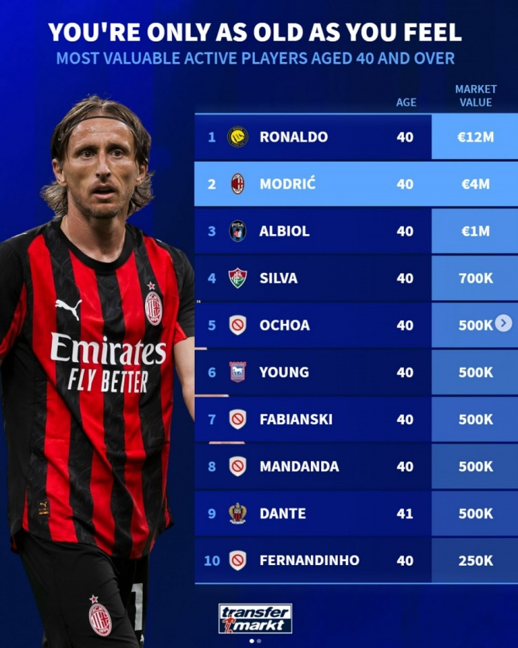 莫德里奇迎来40岁诞辰,德转也盘货了现役足坛40岁及以上球员身价榜,其中C罗居首,莫德里奇次席。