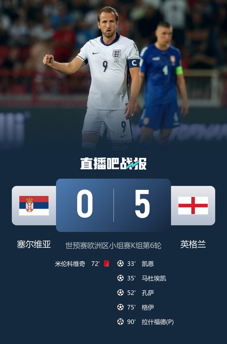 凯恩破门,英格兰5-0大捷塞尔维亚,连接以全胜战绩在小组中领跑。