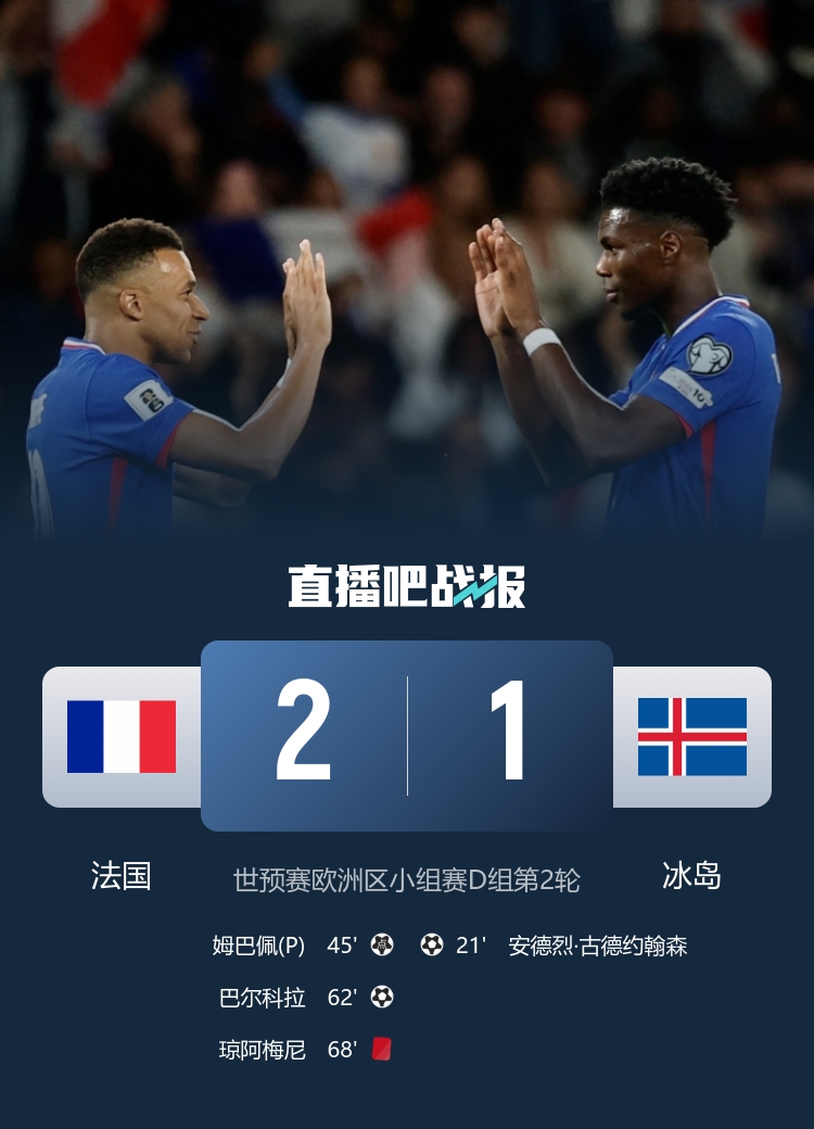姆巴佩点射,巴尔科拉破门,琼阿梅尼直红,法国2-1校服冰岛两连胜领跑。