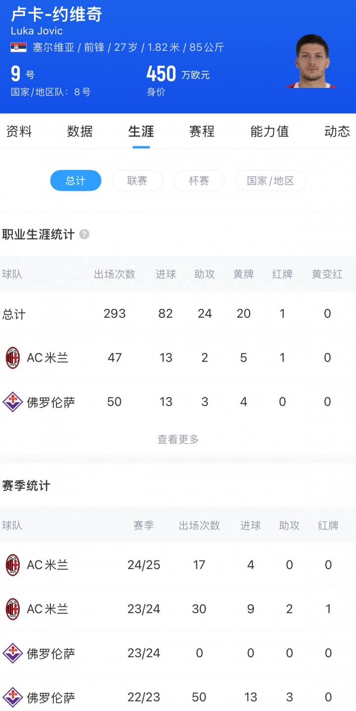2023年夏窗,米兰破耗50万欧元的转会费,从佛罗伦萨签下约维奇。27岁的约维奇本赛季为米兰出场17次打进4球。球员德回身价仅为450万欧,他巅峰时曾达到过6000万欧。