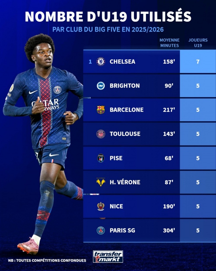 你的位置:英超直播 > 意甲 > 本赛季五大联赛使用U19球员数目:切尔西7东说念主最多,巴萨、巴黎5东说念主