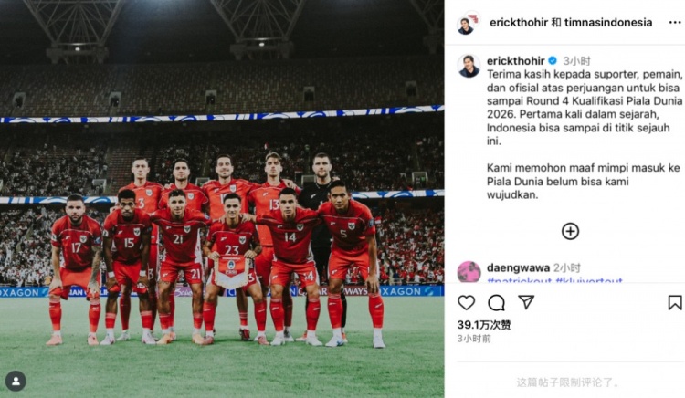 赛后印尼足协主席托希尔在社媒谈到了印尼队的进展,他写谈: