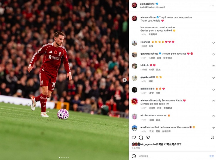 本场比赛麦卡利斯特首发出战,赛后他也在个东谈主社媒晒出本场像片,配文写谈:“咱们的豪情历久不会被越过!感谢安菲尔德!”