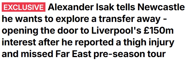 07月24日讯 邮报独家音信,伊萨克示知纽卡我方思寻求转会,这为利物浦引进他绽开了大门。